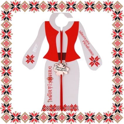 Martisor ambalat pe suport de carton de culoare bej in forma de costum popular romanesc cu motive traditionale. Plic de hartie imprimat cu motive traditionale romanesti CADOU!
