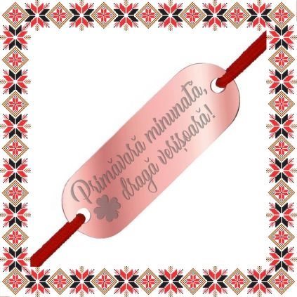 Bratara martisor cu pandantiv in forma de placuta ovala de culoare rose gold gravata cu trifoi norocos si urarea Primavara minunata, draga verisoara! Daruieste martisoare personalizate! Un martisor norocos si incarcat de semnificatie ce se preteaza a fi purtat to anul!