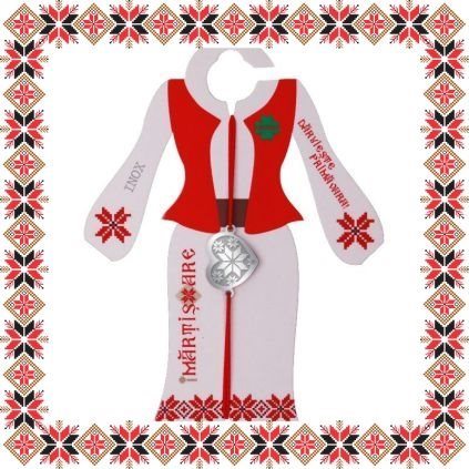 Martisor ambalat pe suport de carton de culoare bej in forma de costum popular romanesc cu motive traditionale. Plic de hartie imprimat cu motive traditionale romanesti si snur de martisor CADOU!