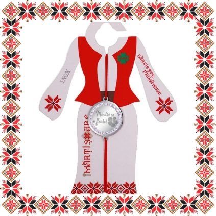 Martisor ambalat pe suport de carton in forma de costum popular romanesc de culoare bej cu motive traditionale romanesti. Martisorul este insotit de plic de hartie imprimat cu motive traditionale romanesti si snur de martisor. Deasemenea veti primi alaturi de martisor bucuria cu care noi l-am creat, tot ce trebuie sa faceti este sa adaugati bucuria daruirii si sa il oferiti persoanei dragi impreuna cu primavara.