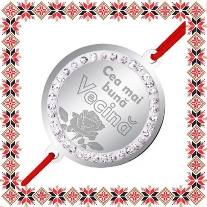 Bratara martisor cu pandantiv de inox in forma de banut de culoare argintie cu pietre multifatetate transparente, gravata cu floare de trandafir si mesajul Cea mai buna vecina! Alege un martisor realizat din otel inoxidabil pentru ca primitoarea il va putea purta tot anul, fa-o sa zambeasca odata cu venirea primaverii!