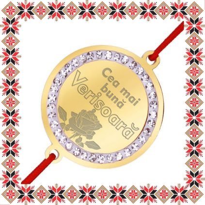 Bratara martisor cu pandantiv de inox in forma de banut de culoare aurie cu pietre multifatetate transparente, gravata cu floare de trandafir si mesajul Cea mai buna verisoara! Alege un martisor realizat din otel inoxidabil pentru ca primitoarea il va putea purta tot anul, fa-o sa zambeasca odata cu venirea primaverii!