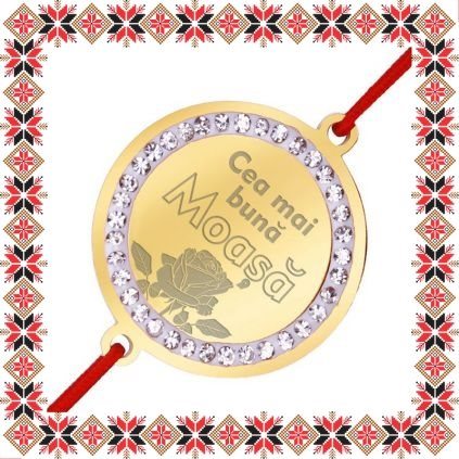 Bratara martisor cu pandantiv de inox in forma de banut de culoare aurie cu pietre multifatetate transparente, gravata cu floare de trandafir si mesajul Cea mai buna moasa! Alege un martisor realizat din otel inoxidabil pentru ca primitoarea il va putea purta tot anul, fa-o sa zambeasca odata cu venirea primaverii!