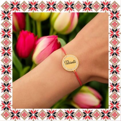 Bratara martisor cu pandantiv de inox in forma de banut de culoare aurie cu pietre multifatetate transparente, gravata cu una dintre calitatile ei, doamna draga din viata ta, este toleranta. Alege un martisor realizat din otel inoxidabil pentru ca primitoarea il va putea purta tot anul, fa-o sa zambeasca odata cu venirea primaverii!
