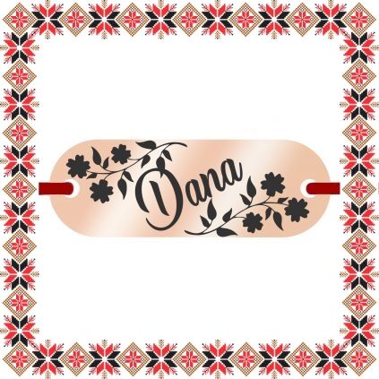 Bratara martisor cu pandantiv de inox in forma de placuta ovala de culoare rose gold gravata cu crengute de flori si numele doamnei dragi din viata ta, Dana. Daruieste martisoare personalizate! Alege un martisor realizat din otel inoxidabil pentru ca primitoarea il va putea purta tot anul, fa-o sa zambeasca odata cu venirea primaverii!