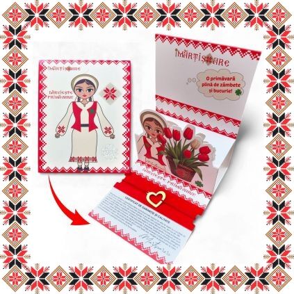 Martisor ambalat premium pe suport de carton tip felicitare 3D de culoare bej cu catifea rosie, tematica inspirata din folclor si stil prietenos, design traditional reinterpretat modern. Snur de martisor si plic de hartie imprimat cu motive traditionale romanesti CADOU!