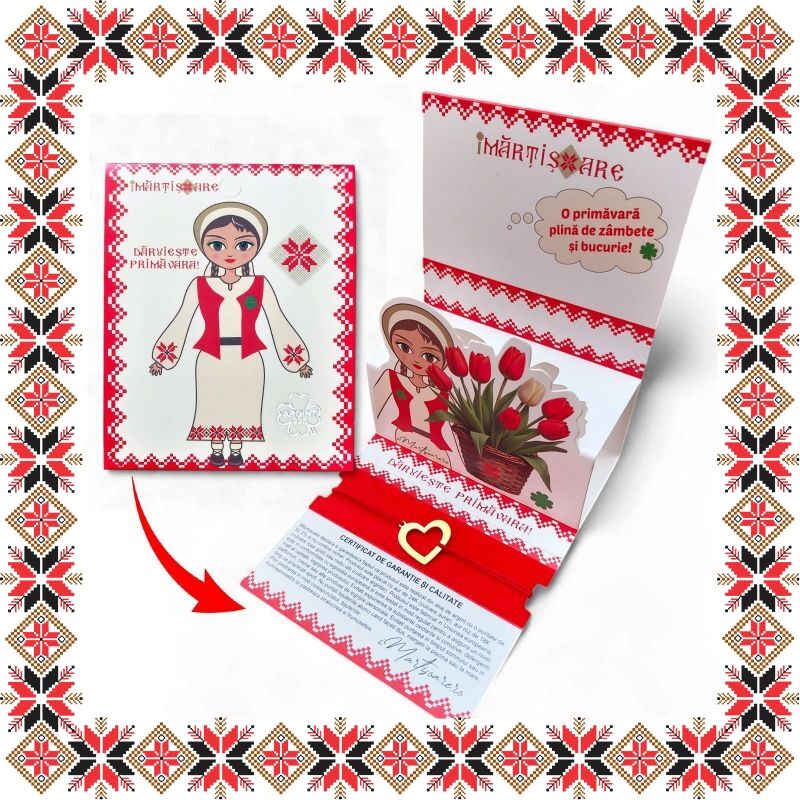 Martisor ambalat premium pe suport de carton tip felicitare 3D de culoare bej cu catifea rosie, tematica inspirata din folclor si stil prietenos, design traditional reinterpretat modern.