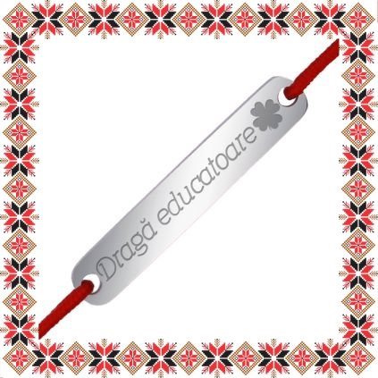 Bratara martisor cu pandantiv in forma de placuta dreptunghiulara de culoare argintie gravata cu trifoi norocos si mesajul Draga educatoare! Ofera primavara cu un martisor special. Alege un martisor realizat din otel inoxidabil pentru ca nu isi schimba culoarea, este rezistent in timp si poate fi purtat tot anul ca accesoriu bratara potrivit oricarei tinute. Ofera primavara in dar cu un martisor special! Gravam cu bucurie!