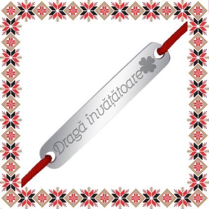 Bratara martisor cu pandantiv in forma de placuta dreptunghiulara de culoare argintie gravata cu trifoi norocos si mesajul Draga invatatoare! Ofera primavara cu un martisor special. Alege un martisor realizat din otel inoxidabil pentru ca nu isi schimba culoarea, este rezistent in timp si poate fi purtat tot anul ca accesoriu bratara potrivit oricarei tinute. Ofera primavara in dar cu un martisor special! Gravam cu bucurie!