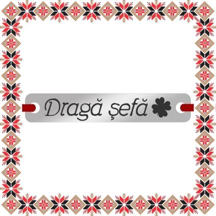Bratara martisor cu pandantiv in forma de placuta dreptunghiulara de culoare argintie gravata cu trifoi norocos si mesajul Draga sefa! Ofera primavara cu un martisor special. Alege un martisor realizat din otel inoxidabil pentru ca nu isi schimba culoarea, este rezistent in timp si poate fi purtat tot anul ca accesoriu bratara potrivit oricarei tinute. Ofera primavara in dar cu un martisor special! Gravam cu bucurie!