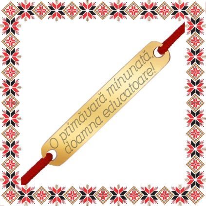 Bratara martisor cu pandantiv in forma de placuta dreptunghiulara de culoare aurie gravata mesajul O primavara minunata, doamna educatoare! Alege un martisor realizat din otel inoxidabil pentru ca nu isi schimba culoarea, este rezistent in timp si poate fi purtat tot anul ca accesoriu bratara potrivit oricarei tinute. Ofera primavara in dar cu un martisor special! Gravam cu bucurie!