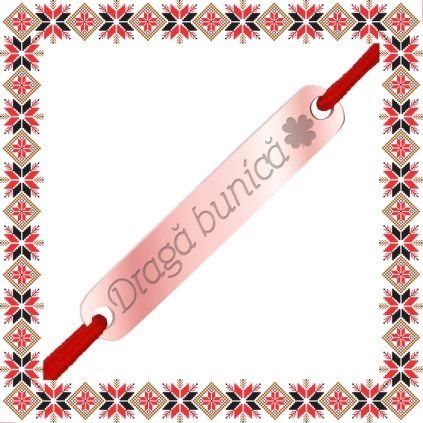 Bratara martisor cu pandantiv in forma de placuta dreptunghiulara de culoare rose gold gravata cu trifoi norocos si mesajul Draga bunica! Alege un martisor realizat din otel inoxidabil pentru ca nu isi schimba culoarea, este rezistent in timp si poate fi purtat tot anul ca accesoriu bratara potrivit oricarei tinute. Ofera primavara in dar cu un martisor special! Gravam cu bucurie!