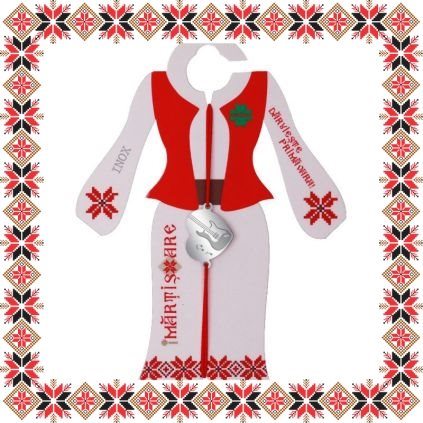 Martisor ambalat pe suport de carton de culoare bej in forma de costum popular romanesc cu motive traditionale. Plic de hartie imprimat cu motive traditionale romanesti si snur de martisor CADOU!