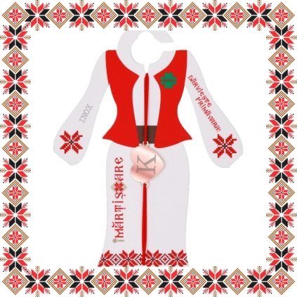 Martisor ambalat pe suport de carton de culoare bej in forma de costum popular romanesc cu motive traditionale. Plic de hartie imprimat cu motive traditionale romanesti si snur de martisor CADOU!