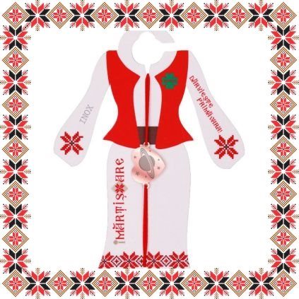 Martisor ambalat pe suport de carton de culoare bej in forma de costum popular romanesc cu motive traditionale. Plic de hartie imprimat cu motive traditionale romanesti si snur de martisor CADOU!