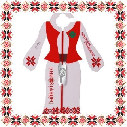 Martisor ambalat pe suport de carton de culoare bej in forma de costum popular romanesc cu motive traditionale. Plic de hartie imprimat cu motive traditionale romanesti CADOU!