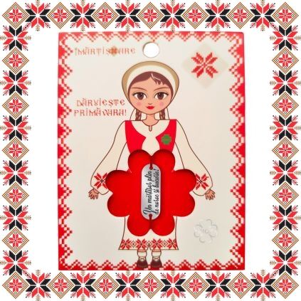 Martisor ambalat pe suport de carton cu catifea rosie si plic de carton cu motive traditionale.