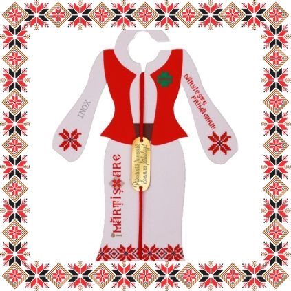 Martisor ambalat pe suport de carton de culoare bej in forma de costum popular romanesc cu motive traditionale. Plic de hartie imprimat cu motive traditionale romanesti CADOU!