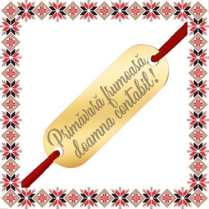 Bratara martisor cu pandantiv in forma de placuta ovala de culoare aurie gravata cu mesajul Primavara frumoasa, doamna contabil! Martisor personalizat cu urare de 1 martie! Un martisor personalizat, incarcat de semnificatie, creat special pentru ea! Alege un martisor realizat din otel inoxidabil pentru ca nu isi schimba culoarea, este rezistent in timp si poate fi purtat tot anul ca accesoriu bratara potrivit oricarei tinute. Ofera primavara in dar cu un martisor special!