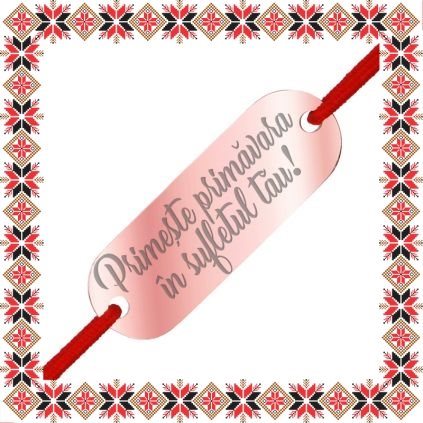 Bratara martisor cu pandantiv in forma de placuta ovala de culoare rose gold gravata cu mesajul Primeste primavara in sufletul tau! Martisor personalizat cu drag pentru ea! Un martisor personalizat, incarcat de semnificatie, creat special pentru ea! Alege un martisor realizat din otel inoxidabil pentru ca nu isi schimba culoarea, este rezistent in timp si poate fi purtat tot anul ca accesoriu bratara potrivit oricarei tinute. Ofera primavara in dar cu un martisor special!