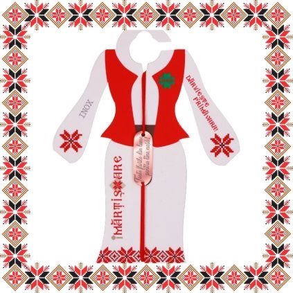 Martisor ambalat pe suport de carton de culoare bej in forma de costum popular romanesc cu motive traditionale. Plic de hartie imprimat cu motive traditionale romanesti CADOU!