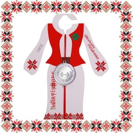 Martisor ambalat pe suport de carton in forma de costum popular romanesc de culoare bej cu motive traditionale romanesti. Martisorul este insotit de plic de hartie imprimat cu motive traditionale romanesti si snur de martisor. Deasemenea veti primi alaturi de martisor bucuria cu care noi l-am creat, tot ce trebuie sa faceti este sa adaugati bucuria daruirii si sa il oferiti persoanei dragi impreuna cu primavara.