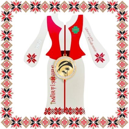 Martisor ambalat pe suport de carton in forma de costum popular romanesc de culoare bej cu motive traditionale romanesti. Martisorul este insotit de plic de hartie imprimat cu motive traditionale romanesti si snur de martisor. Deasemenea veti primi alaturi de martisor bucuria cu care noi l-am creat, tot ce trebuie sa faceti este sa adaugati bucuria daruirii si sa il oferiti persoanei dragi impreuna cu primavara.