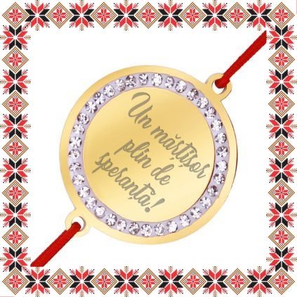 Bratara martisor cu pandantiv de inox in forma de banut de culoare aurie cu pietre multifatetate transparente, gravata cu mesajul Un martisor plin de speranta! Un martisor personalizat, incarcat de semnificatie, creat special pentru ea! Alege un martisor realizat din otel inoxidabil pentru ca nu isi schimba culoarea, este rezistent in timp si poate fi purtat tot anul ca accesoriu bratara potrivit oricarei tinute. Ofera primavara in dar cu un martisor special!