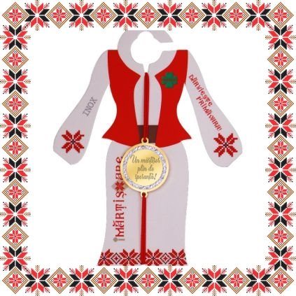 Martisor ambalat pe suport de carton in forma de costum popular romanesc de culoare bej cu motive traditionale romanesti. Martisorul este insotit de plic de hartie imprimat cu motive traditionale romanesti si snur de martisor. Deasemenea veti primi alaturi de martisor bucuria cu care noi l-am creat, tot ce trebuie sa faceti este sa adaugati bucuria daruirii si sa il oferiti persoanei dragi impreuna cu primavara.