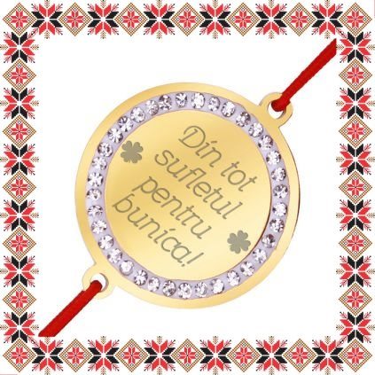 Bratara martisor cu pandantiv de inox in forma de banut de culoare aurie cu pietre multifatetate transparente, gravata cu mesajul Din tot sufletul pentru bunica! Martisor creat cu drag! Un martisor personalizat, incarcat de semnificatie, creat special pentru ea!Alege un martisor realizat din otel inoxidabil pentru ca nu isi schimba culoarea, este rezistent in timp si poate fi purtat tot anul ca accesoriu bratara potrivit oricarei tinute. Ofera primavara in dar cu un martisor special!