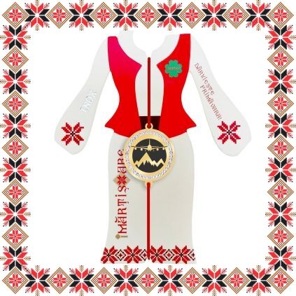 Martisor ambalat pe suport de carton in forma de costum popular romanesc de culoare bej cu motive traditionale romanesti. Martisorul este insotit de plic de hartie imprimat cu motive traditionale romanesti si snur de martisor. Deasemenea veti primi alaturi de martisor bucuria cu care noi l-am creat, tot ce trebuie sa faceti este sa adaugati bucuria daruirii si sa il oferiti persoanei dragi impreuna cu primavara.