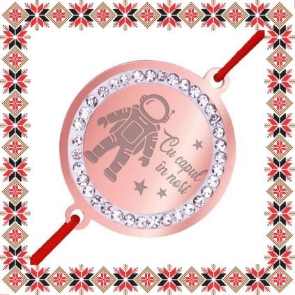 Bratara martisor cu pandantiv de inox in forma de banut de culoare rose gold cu pietre multifatetate transparente, gravat cu astronaut si mesajul Cu capul in nori. Martisor creat cu bucurie! Alege un martisor realizat din otel inoxidabil pentru ca primitoarea il va putea purta tot anul, fa-o sa zambeasca odata cu venirea primaverii!