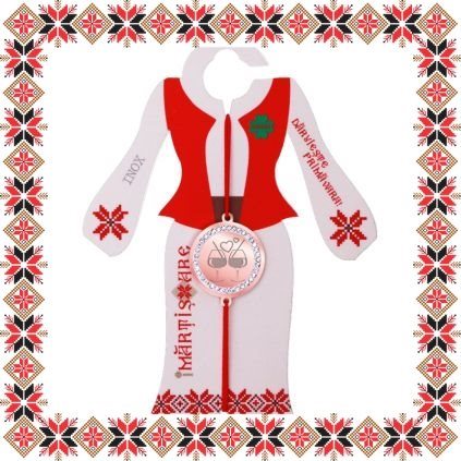 Martisor ambalat pe suport de carton in forma de costum popular romanesc de culoare bej cu motive traditionale romanesti. Martisorul este insotit de plic de hartie imprimat cu motive traditionale romanesti si snur de martisor. Deasemenea veti primi alaturi de martisor bucuria cu care noi l-am creat, tot ce trebuie sa faceti este sa adaugati bucuria daruirii si sa il oferiti persoanei dragi impreuna cu primavara.