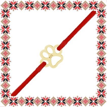 Bratara martisor cu snur rosu elastic si pandantiv din argint 925 placat cu aur 24K reprezentand conturul unei labute de catel. Daruieste pretiozitate si eleganta de martisor! Daruieste un cadou care o va face sa straluceasca!