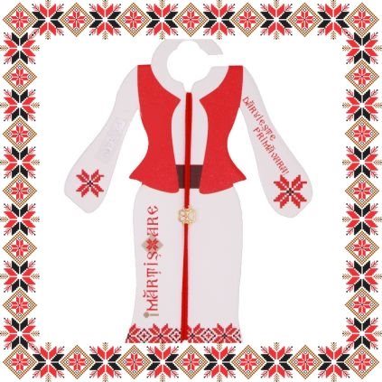 Martisor ambalat pe suport de carton de culoare bej in forma de costum popular romanesc cu motive traditionale. CADOU! Snur de martisor + ambalaj elegant + plic cu motive traditionale romanesti, adica tot ce ai nevoie pentru a darui un cadou complet de martisor!