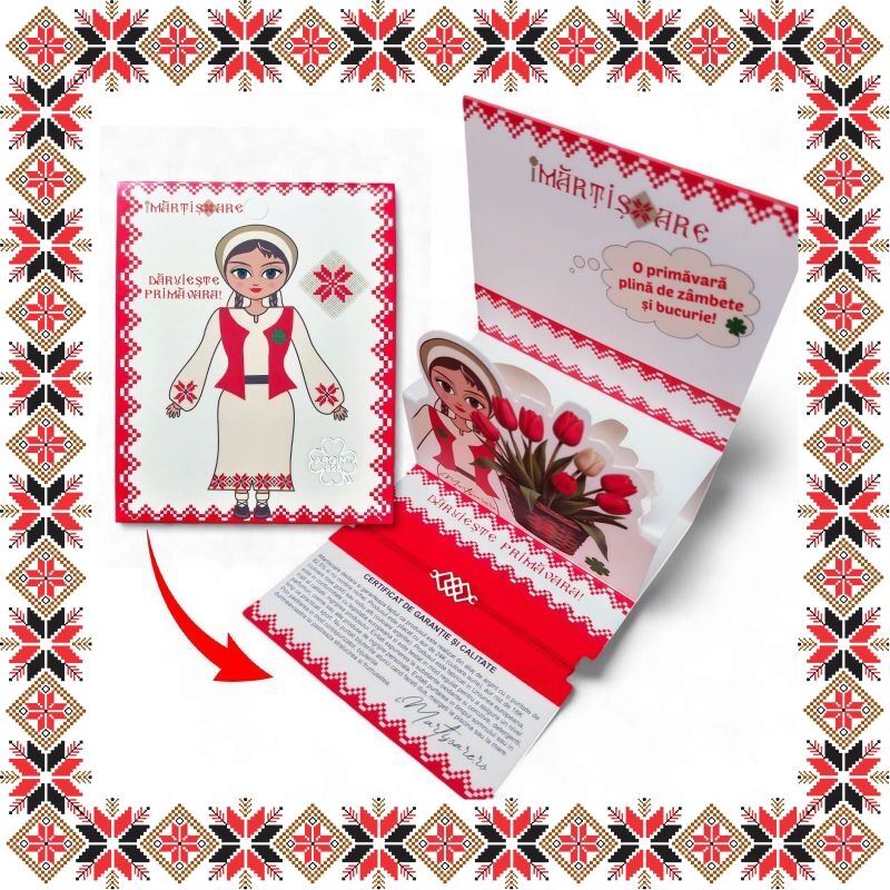 Martisor ambalat premium pe suport de carton tip felicitare 3D de culoare bej cu catifea rosie, tematica inspirata din folclor si stil prietenos, design traditional reinterpretat modern. Snur de martisor si plic de hartie imprimat cu motive traditionale romanesti CADOU!