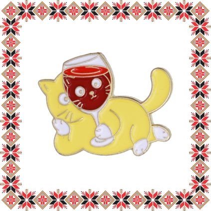 Brosa martisor in forma de pisicuta cu pahar de vin realizata din email galben, rosu si alb pe baza metalica de culoare aurie. Martisor vesel si prietenos!