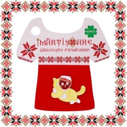 Martisor ambalat pe carton de culoare bej in forma de ie romaneasca cu motive traditionale romanesti si catifea de culoare rosie. Cartonul este inscriptionat cu urarea Daruieste Primavara si Noroc intr-un trifoias cu patru foi verde!