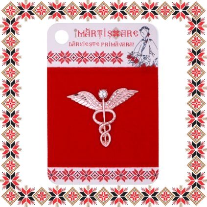 Brosa martisor in forma de caduceu, simbol al medicinei, realizata din pietricele multifatetate transparente pe baza metalica de culoare rose gold. Daruieste recunostinta de martisor!