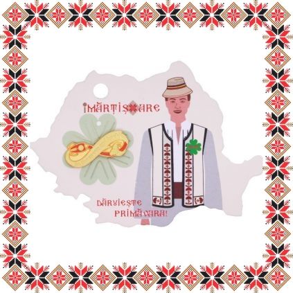 Martisor ambalat pe suport de carton in forma hartii Romaniei, de culoare bej cu motive traditionale romanesti. Ambalajul este inscriptionat cu urarea Daruieste Primavara!