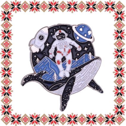 Brosa martisor in forma de astronaut cu balena, multi, planete si racheta. Realizata din email albastru, bleumarin, alb si rosu pe baza metalica argintie. Brosa tip pin cu sistem de prindere ac. Un martisor potrivit pentru persoanele pasionate de planete si stele, astronomie si pentru cei care se gandesc la binele planetei noastre.