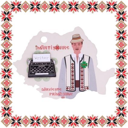 Brosa martisor in forma unei masini de scris clasice cu mesajul Writer (Scriitor). Realizata din email negru si alb pe baza metalica argintie. Brosa tip pin cu sistem de prindere ac. Un martisor potrivit pentru pasionati ai cuvintelor, scriitori, copywriteri, poeti, profesori de limba romana dar si pentru content creatori motivationali.