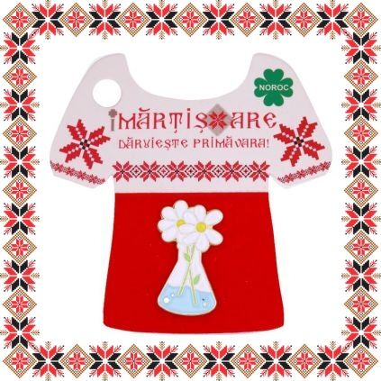 Martisor ambalat pe suport de carton in forma de ie romaneasca, de culoare bej cu motive traditionale romanesti si catifea de culoare rosie. Ambalajul este inscriptionat cu urarea Daruieste Primavara!