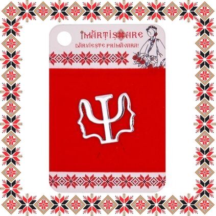 Brosa martisor reprezentand simbolul Psi si doua siluete, realizata din metal de culoare argintie. Brosa tip pin cu sistem de prindere ac. Un martisor potrivit pentru psihologi, terapeuti, psihiatri si toti cei pasionati de studiul mintii. Daruieste pasiune de martisor!