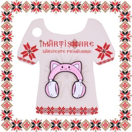 Brosa martisor in forma de casti audio cu urechi de pisicuta. Realizata din email alb si roz pe baza metalica din aliaj. Brosa tip pin cu sistem de prindere ac. Un martisor copilaros si vesel, potrivit doamnelor pentru care muzica inseamna relaxare si bucurie si pe care vrei sa le faci sa zambeasca cu un accesoriu simpatic.