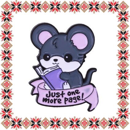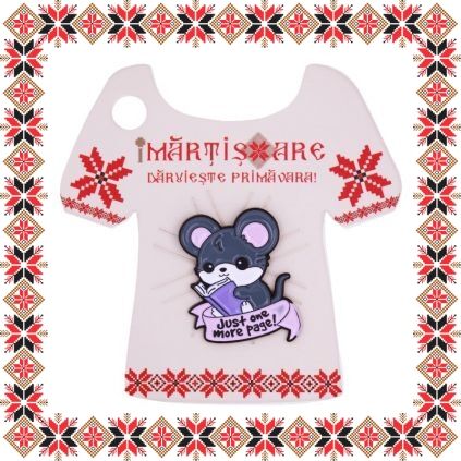 Brosa martisor in forma de soricel citind si mesajul Just one more page. Realizata din email roz, alb gri si mov pe baza metalica din aliaj. Brosa tip pin cu sistem de prindere ac. Un martisor de poveste, daruieste-l celor carora le place sa se relaxeze la umbra cartilor si adora mirosul foilor rasfoite in seri linistite de primavara.