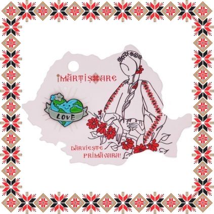 Martisor ambalat pe suport de carton de culoare bej in forma hartii Romaniei cu motive traditionale romanesti. Ambalajul este inscriptionat cu urarea Daruieste Primavara!