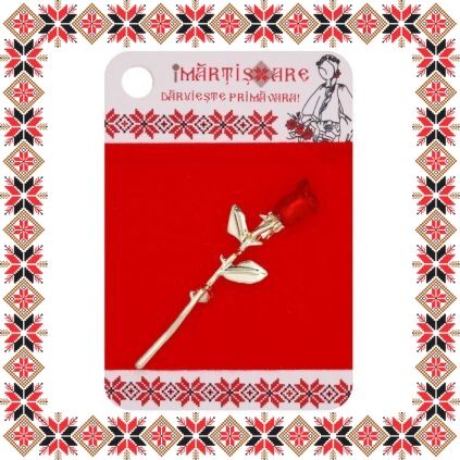 Brosa martisor in forma de boboc de trandafir rosu, realizat din email de culoare rosie pe baza metalica aurie. Brosa cu sistem de prindere agrafa. Un martisor romantic si elegant cu care nu poti da gres in nici o situatie, potrivit oricarei doamne careia iti doresti sa ii daruiesti primavara.