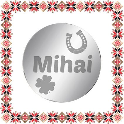 Martisor tip brosa gravata cu trifoi cu patru foi, potcoava si numele Mihai, pe baza in forma de banut de inox de culoare argintie. O brosa special creata pentru el cu care nu poti da gres, un mod original de a-i darui primavara. Martisor realizat din otel inoxidabil, un material rezistent care nu isi modifica culoarea sau aspectul in timp si care straluceste elegant, ca o mica bijuterie. Gravam cu bucurie martisoare special create pentru oamenii dragi din viata ta!