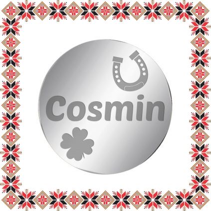Martisor tip brosa gravata cu trifoi cu patru foi, potcoava si numele Cosmin, pe baza in forma de banut de inox de culoare argintie. O brosa special creata pentru el cu care nu poti da gres, un mod original de a-i darui primavara. Martisor realizat din otel inoxidabil, un material rezistent care nu isi modifica culoarea sau aspectul in timp si care straluceste elegant, ca o mica bijuterie. Gravam cu bucurie martisoare special create pentru oamenii dragi din viata ta!